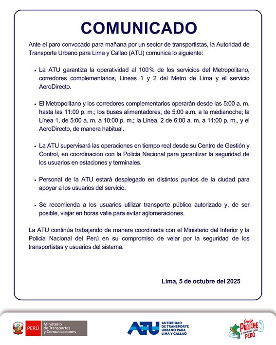 Por su parte, la Autoridad de Transporte Urbano para Lima y Callao (ATU) informó que garantiza la operatividad del servicio del Metropolitano y los corredores complementarios.