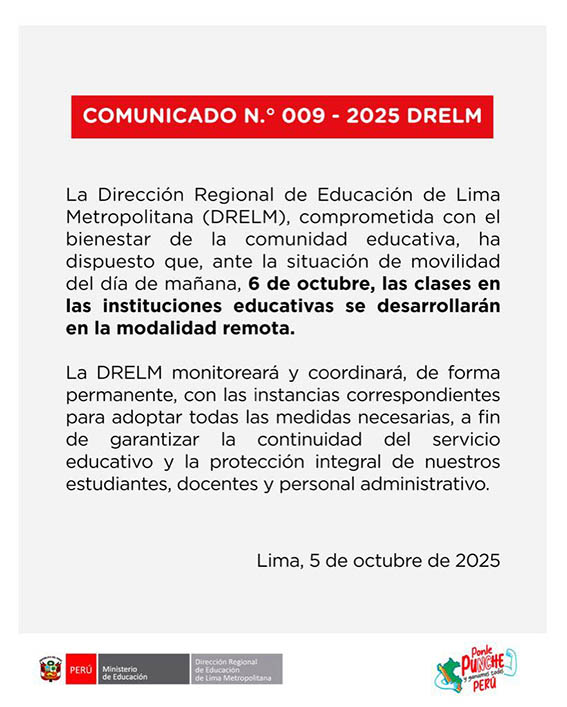 «La Dirección Regional de Educación de Lima Metropolitana (DRELM), comprometida con el bienestar de la comunidad educativa, ha dispuesto que, ante la situación de movilidad del día de mañana, 6 de octubre, las clases en las instituciones educativas se desarrollarán en la modalidad remota«, se lee en el comunicado difundida en la cuenta institucional de X (Twitter).