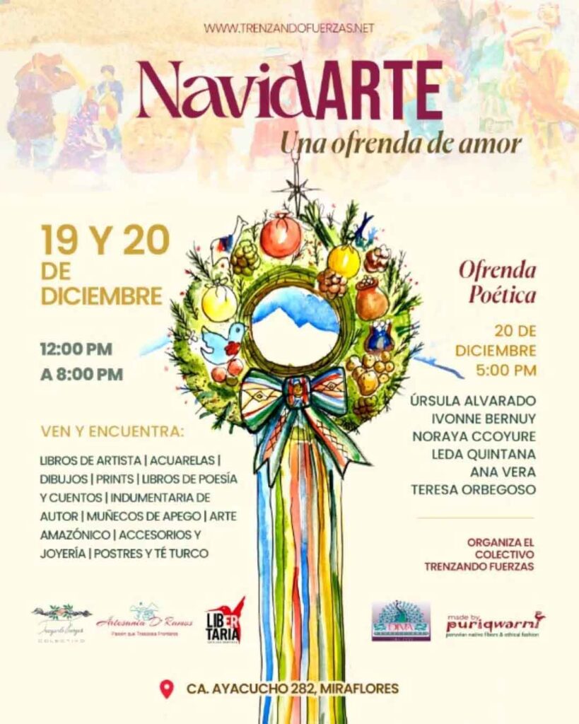 En «NAVIDARTE, una ofrenda de amor», el público podrá encontrar piezas hechas como ofrendas de arte, poesía y amor. Creaciones de arte tradicional como de arte contemporáneo: libros de artista, acuarelas, diseños con tintes naturales, dibujos, prints, libros de poesía y cuentos; bolsos y monederos en arpillería, indumentaria de autor, juguetería textil y muñecos de apego en fibras nativas; arte shipibo, accesorios y joyería textil. La exposición se podrá visitar el 19 y 20 de diciembre, en el horario de 12:00 a 8:00 pm en Calle Ayacucho 282, Miraflores.