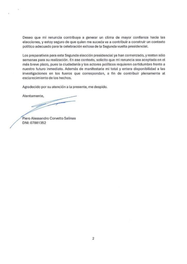 La salida de Corvetto se produce en un momento de extrema vulnerabilidad para el sistema electoral, con los preparativos para la segunda vuelta ya en marcha. En su texto, insta a la JNJ a aceptar su dimisión en el «más breve plazo» para permitir que un sucesor asuma el liderazgo de la ONPE y logre construir el contexto político adecuado para la culminación del calendario electoral. «Solicito que mi renuncia sea aceptada en el más breve plazo, pues la ciudadanía y los actores políticos requieren certidumbre frente a nuestro futuro inmediato», expresa el funcionario.